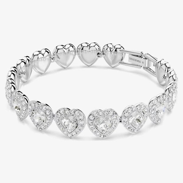 Romantic sparkle takes centre stage with the Swarovski Ariana Grande X Swarovski Capsule White Crystal Heart Bracelet 5720860. Crafted in a silver-tone rhodium plated finish, this fashion bracelet forms a full circle of heart-shaped Swarovski crystals, each framed by a halo of white pavé for a luminous, light-catching look. A fold over clasp keeps the silhouette clean and secure, making it an easy choice for dressing up evening looks or adding shine to everyday styling.