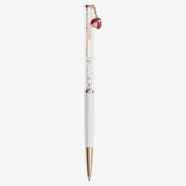 Add a touch of sparkle to every word with the Swarovski Crystalline Rose Gold Tone Plated Ladybird Pen. This elegant slimline ballpoint pen features a lacquered white barrel and a long transparent window filled with around 400 clear crystals for signature Swarovski brilliance. Finished with rose gold-tone plating and adorned with a charming red ladybird motif, symbolising protection and prosperity, it’s a timeless accessory for creativity, gifting, or everyday luxury.