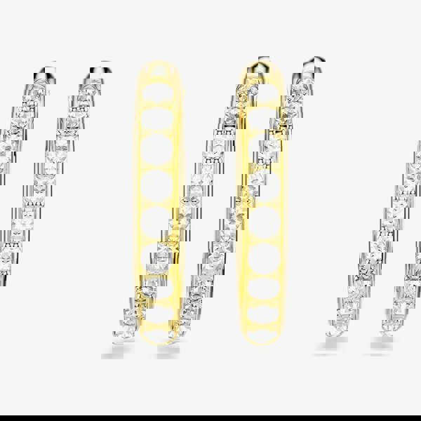 Make a bold statement with these geometric hoop earrings. Featuring a sleek octagonal shape, they frame a single row of clear round-cut crystals, each set delicately in prongs. Designed for ease and comfort, the gold-tone plated earrings include a convenient spring plate mechanism for effortless opening and closing.