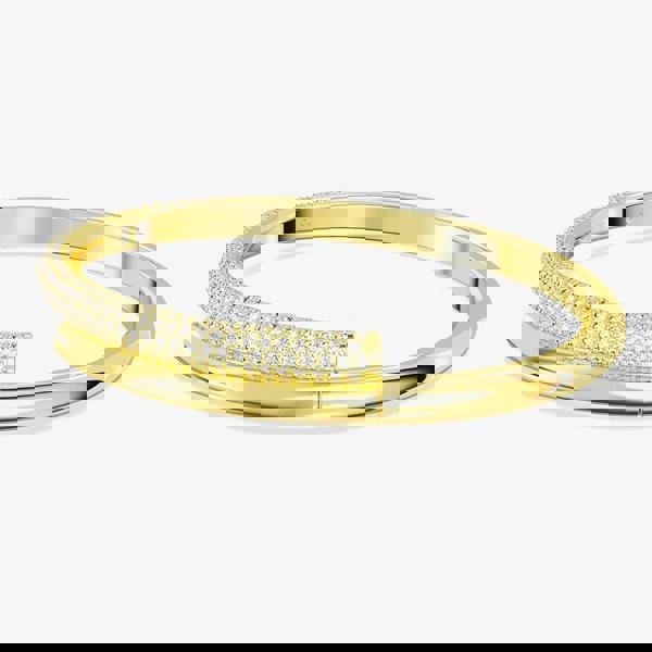 This sleek crossover bangle has a tubular design that blends classic and contemporary styles. It is half embellished with an all-over clear Swarovski crystal pavé and has a hidden magnetic closure for a secure fitting. This luxurious piece will enhance any style you wear.