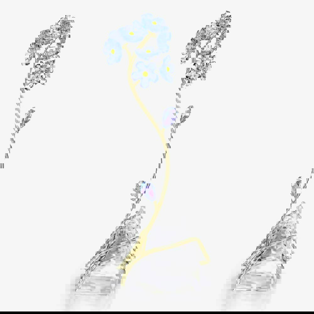 The intricately designed blue forget-me-not features 876 facets that catch and reflect light, elegantly positioned on a gold-tone metal stem that gracefully intertwines over a natural, unfaceted crystal base. Symbolising genuine love and unwavering faithfulness, this standalone creation serves as a remarkable gift for a beloved individual, serving as a lasting reminder that they hold a special place in your thoughts. No vase or base is necessary for this decorative object.