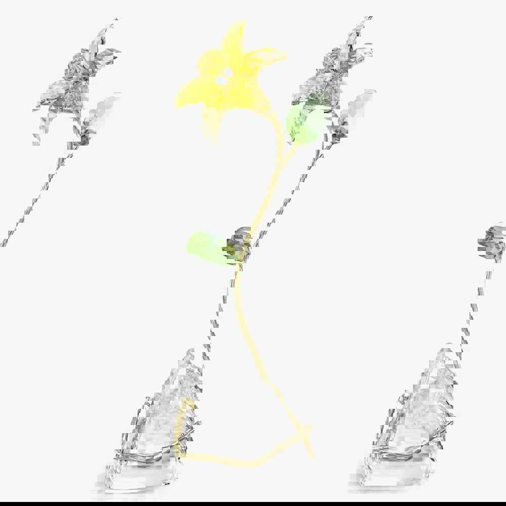 With 222 light-catching facets, this radiant yellow lily is complemented by crystallised green leaves, all delicately positioned on a gold-tone metal stem that gracefully intertwines across a natural, unfaceted crystal base. Symbolising purity and innocence, this stand-alone design serves as a sophisticated enhancement to any home décor. No vase or base is needed for this graceful piece.