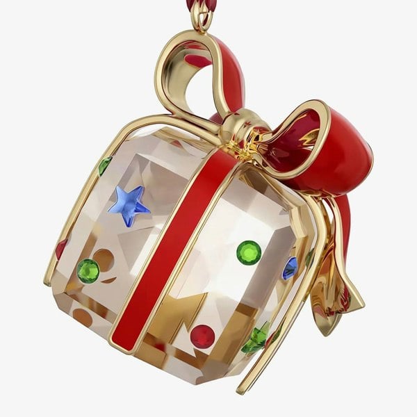 Add a playful sparkle to your tree with this gift-wrapped ornament. Crafted with 426 facets in Swarovski’s Golden Shadow effect, it features red, green, and blue crystals, and a champagne gold-tone ribbon with red lacquer. Suspended from a red grosgrain ribbon, it’s a perfect festive touch or a thoughtful holiday gift. Please note this is a decoration object and is not suitable for children under 15.