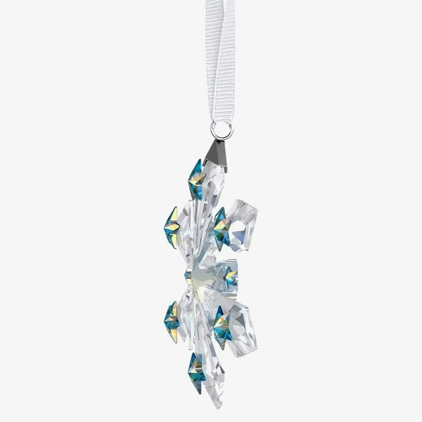 A dazzling star is the centrepiece of any holiday décor. This shimmering ornament offers a fresh take on the classic motif, featuring 288 radiant facets and silver-tone metal accents. Twelve flatback stars in various sizes surround the centre, each crafted with Swarovski’s mesmerizing Aurora Borealis effect. Suspended from a white grosgrain ribbon, this piece will bring joy and wonder throughout the season. Note: This is a decorative object, not a toy, and is not suitable for children under 15.