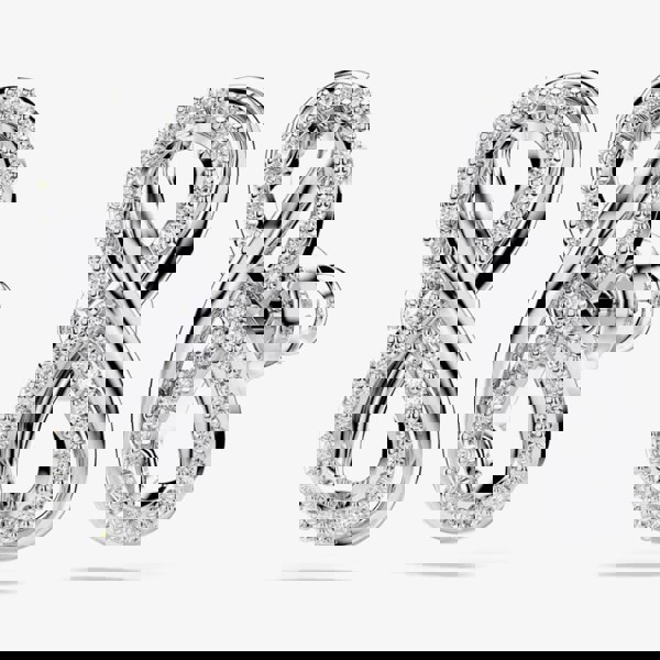 Crafted in rhodium-plated metal, each piece takes the form of an infinity motif and is adorned with an array of clear Swarovski Zirconia.