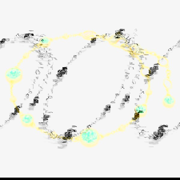 Add a distinctive glow to your look with the Imber bracelet. This gold-tone plated design features a strand of polished metal droplets paired with round green crystals in elegant bezel settings. Finished with a lobster clasp and an adjustable extender, it offers a graceful, light-catching accent to any outfit.