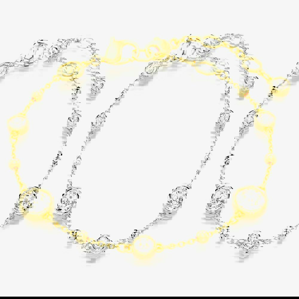The gold-tone plated design features a strand of metal droplets, accented with dazzling round-cut crystals in a puffy bezel setting. Completed with a lobster closure, the bracelet can be worn alone or matched with a pair of radiant earrings from the same family.
