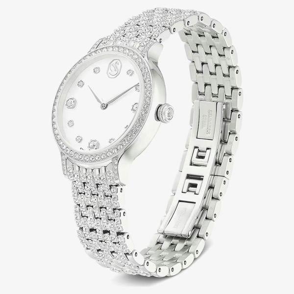 Add a touch of glamour to your wrist with the Swarovski Imber White Crystal Silver Tone Bracelet Watch. Featuring a sunray dial, this elegant timepiece is crafted with a silver-tone stainless steel case and bracelet strap, set with 68 individual sparkling Swarovski crystals for a dazzling finish. Perfect for everyday wear or special occasions, it’s a sophisticated blend of style and sparkle.