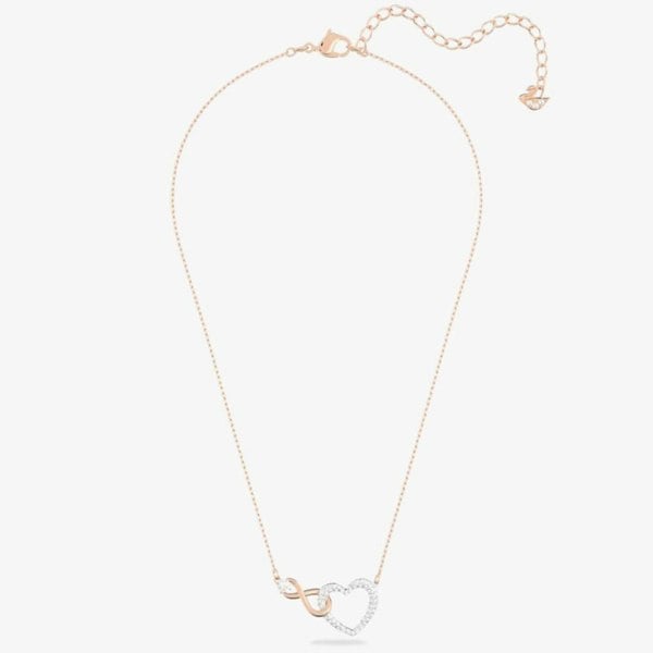 Showcasing an infinity symbol that is suspended upon a rose gold tone plated chain, this stunning necklace is the perfect expression of eternal love. A heart shaped element adorned with sparkling crystals is intertwined with the infinity symbol - a visible representation of the promise of ever lasting love.