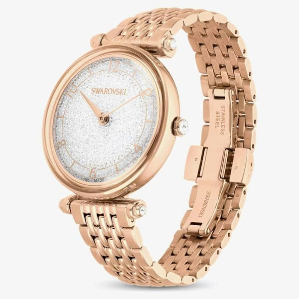 Within our Crystalline Wonder collection, this Swarovski timepiece harmonizes form and functionality seamlessly. Crafted with approximately 1,000 crystals embedded in its stainless steel casing, it radiates a dazzling brilliance. Enhanced by a metal bracelet boasting a rose gold-tone finish, and a white silver tone dial adorned with Arabic numerals and the iconic Swarovski swan at the 12 o'clock mark, its design exudes sophistication.