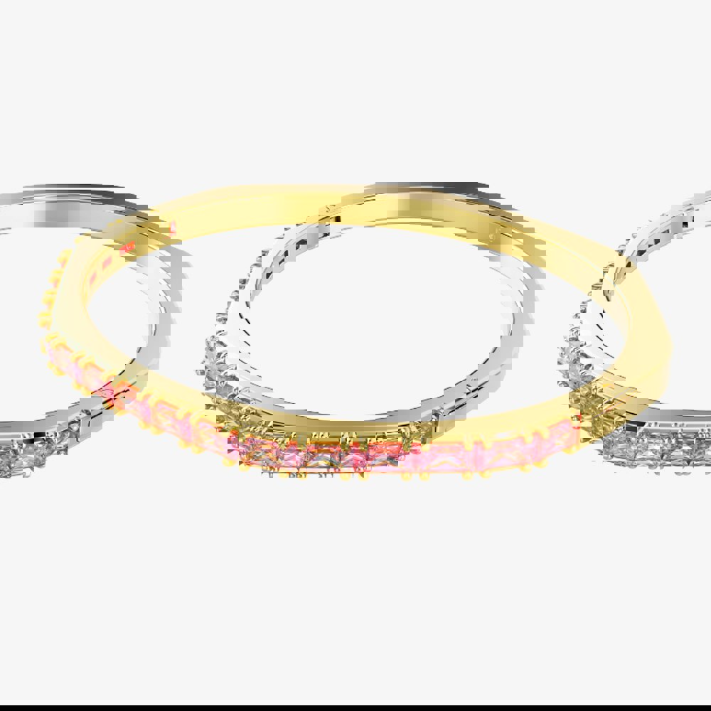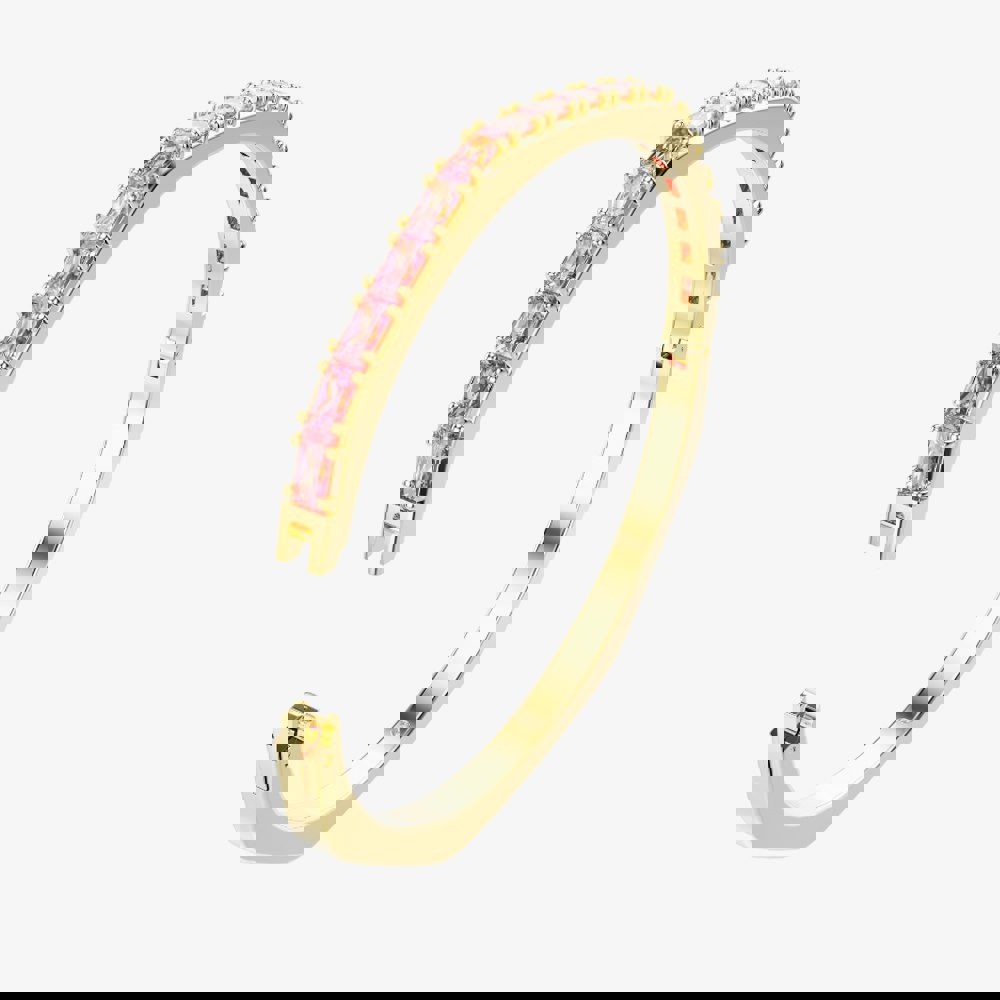 Ignite your everyday look with this hinged Matrix bangle. The gold-tone plated design is crafted in Swarovski’s emblematic octagon shape and is playfully adorned with a gradient of pink baguette-cut Swarovski Zirconia in a horizontal setting. Perfect for stacking alongside matching Matrix bangles, it’s a full surround of signature Swarovski colour to express your most vibrant self.