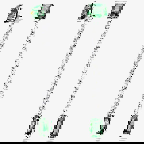The adaptable earrings from the Matrix collection offer two distinct styling options. The rhodium-plated design showcases green rectangular Swarovski Zirconia studs, accompanied by earring jackets adorned with a graceful cascade of clear round stones and a green rectangular Swarovski Zirconia at the conclusion. The earring jackets feature three holes for customisable length adjustments or can be detached, allowing the studs to be worn independently.