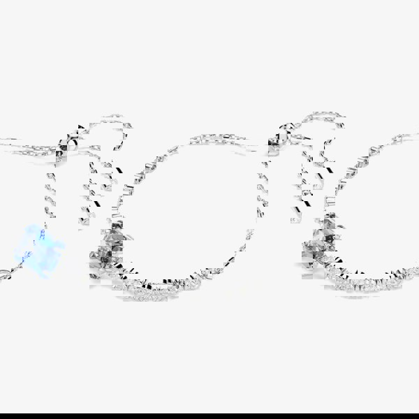 Enhance any look with this radiant classic tennis bracelet, featuring clear Swarovski Zirconia and a burst of colour. Secured with a sliding closure, the rhodium-plated jewellery displays a uniform row of clear Swarovski Zirconia, accented by a baguette-cut blue Swarovski Zirconia at the centre. A vibrant twist on a timeless style.