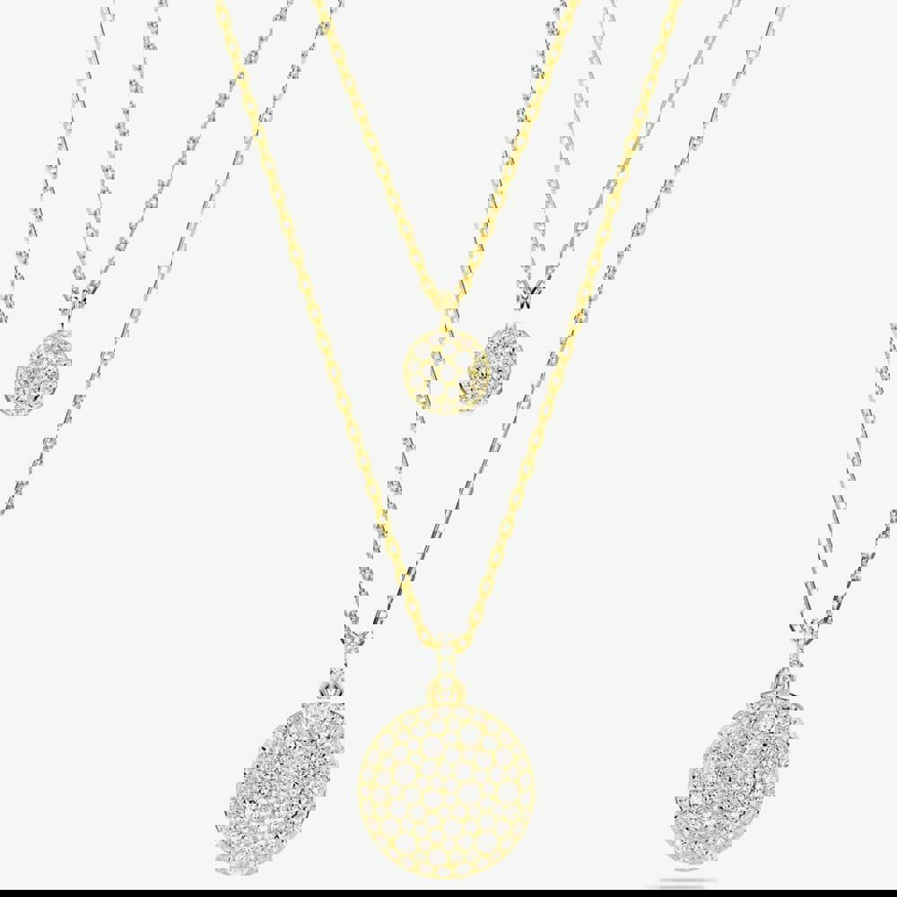 The gold-tone plated design showcases two chains, each hosting a domed meteor motif embellished with a snow pavé of clear round crystals in varying sizes. Adding to its versatility, the pendant can be reversed, unveiling a halo of crystals surrounding the larger motif, and a single crystal at the centre of the smaller motif.