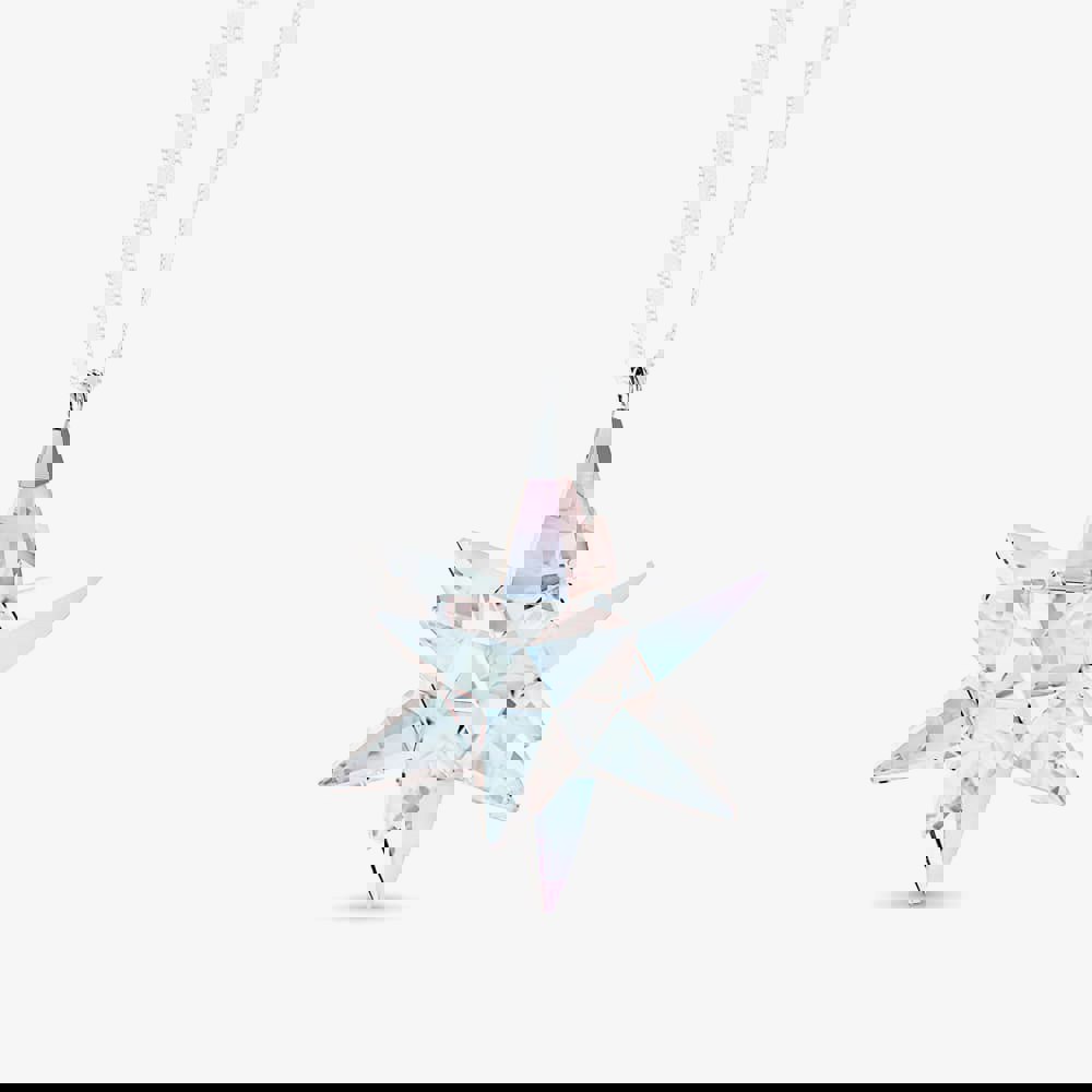 Crafted with 307 sparkling facets, this three-dimensional star refracts light from all angles, producing scintillating hues. The crystal showcases a special Shimmer effect, adding an extra layer of brilliance to its gleam. Suspended gracefully on a white satin ribbon, it makes a festive addition to any decorative set.