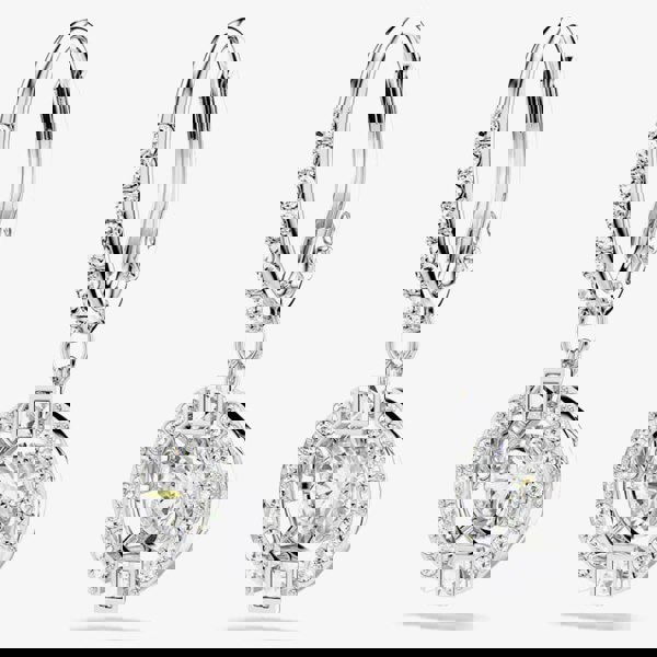 These exquisite earrings highlight a dazzling stone encased within a circular metal structure adorned with crystal pavé. The rhodium-plated design strikes a balance between sophistication and playfulness, making it a must-have addition to any jewellery collection.