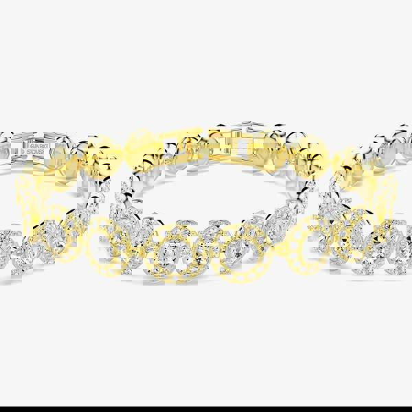 Add timeless sparkle with the Swarovski Una Angelic Gold Tone Plated White Crystal Jewellery Set. This elegant set includes a matching necklace, bracelet and stud earrings, each beautifully finished in gold-tone plating. The bracelet and necklace feature a row of round white Swarovski crystals, each framed by a delicate halo for maximum brilliance, and are secured with fold-over clasps. Perfect for special occasions or as a luxurious gift, this coordinated set brings classic glamour to any jewellery collection.