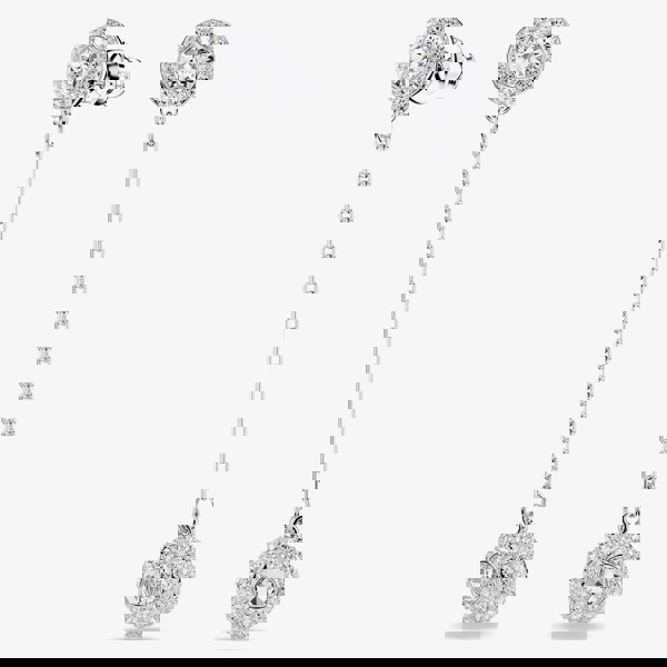 Radiate wonder with these rhodium-plated earrings featuring a double-sided motif adorned with sparkling round-cut crystals. The long chain design allows the motif to be worn hanging or flipped to the back of the stud for versatile styling. Pair with other Una Angelic pieces for ultimate radiance.