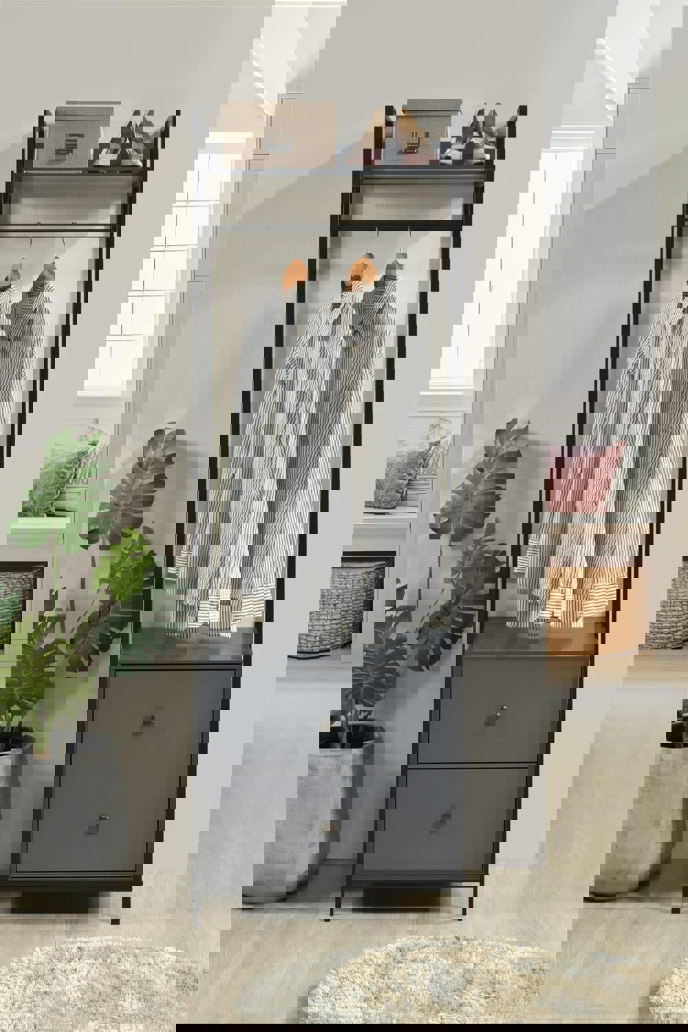 The Alva Open Wardrobe with 2 Drawers in Dark Grey combines industrial style with modern design, making it a sleek and practical addition to any bedroom. Its open frame keeps your space feeling light and uncluttered, while the sturdy hanging rail and two spacious drawers provide plenty of storage for clothes and essentials. With its bold dark grey panels and contrasting black metal frame, this wardrobe pairs perfectly with the Alva Open Wardrobe with 4 Shelves for a seamless, coordinated storage solution in your home.