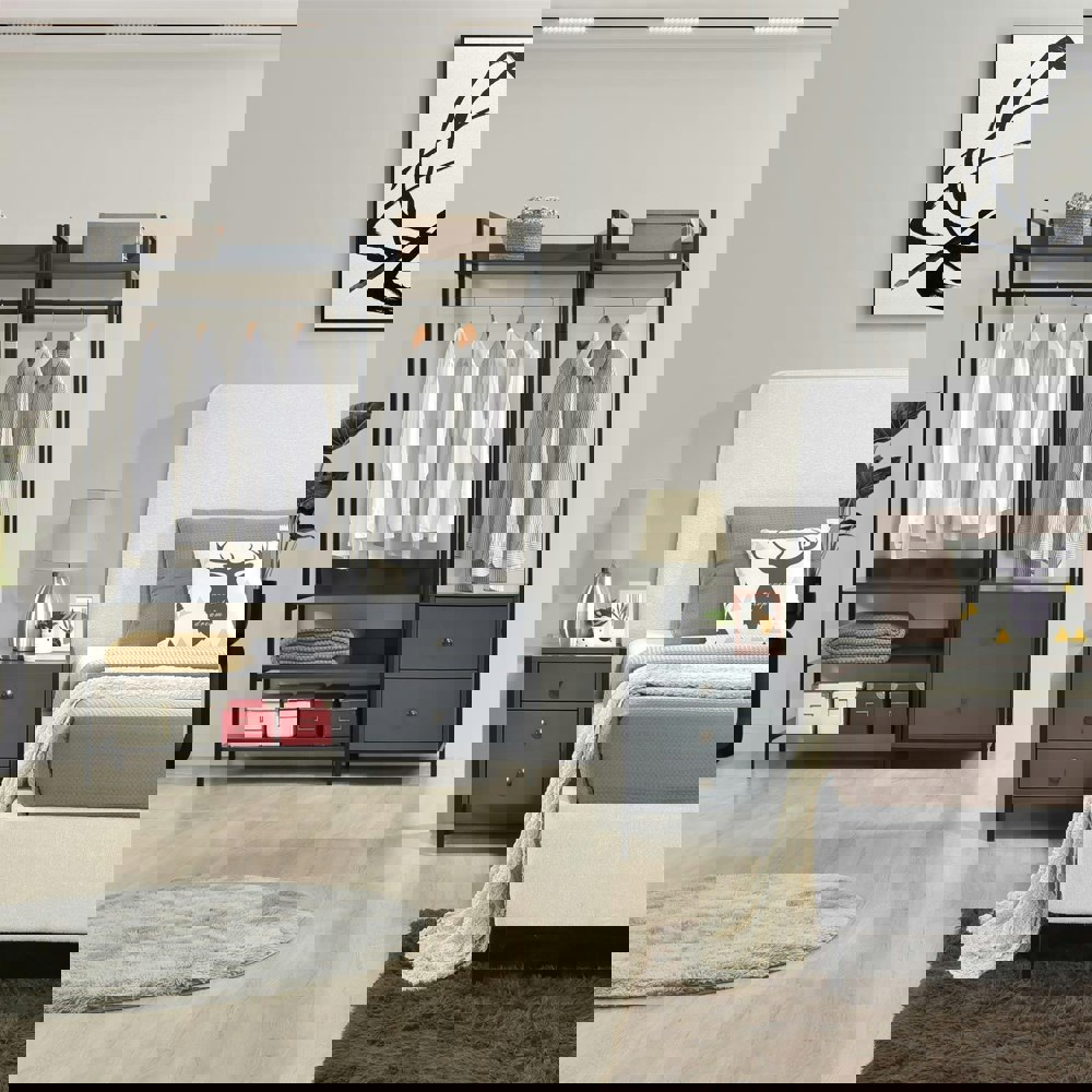 The Alva Trio in Dark Grey is a sleek and modern bedroom storage solution designed to bring both style and practicality to your space. This versatile set includes three essential pieces: an open wardrobe with two drawers, an open wardrobe with four shelves and a three-drawer bedside table.