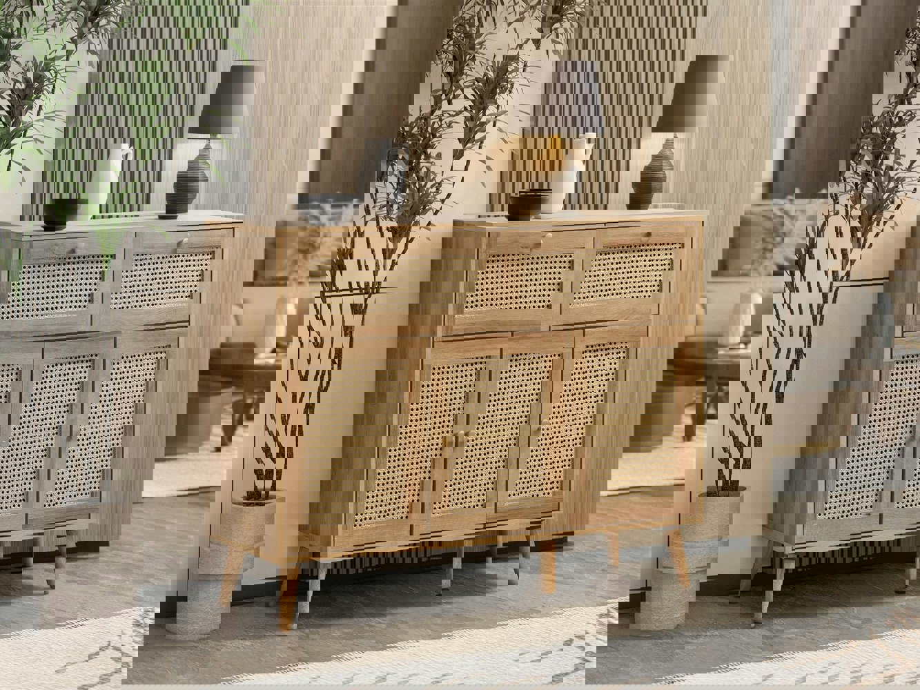 The Manila 2 Drawer 3 Door Sideboard brings together natural textures and warm tones for a laid-back, stylish storage solution. Featuring PVC Rattan detailing across both the drawer and door fronts, framed in a soft oak effect finish, this sideboard adds a touch of rustic charm to any room.
