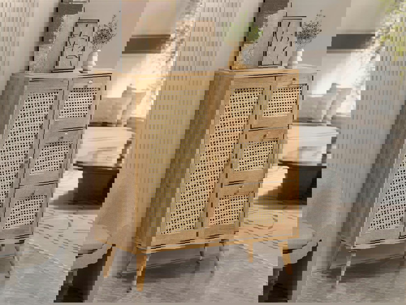The Manila Compact 1 Door 3 Drawer Sideboard is a stylish storage solution that blends natural textures with a space-saving design. Featuring a warm oak-effect frame, the unit has a single cupboard door on the left and three drawers stacked vertically on the right, each finished with PVC Rattan fronts for a soft, organic look.