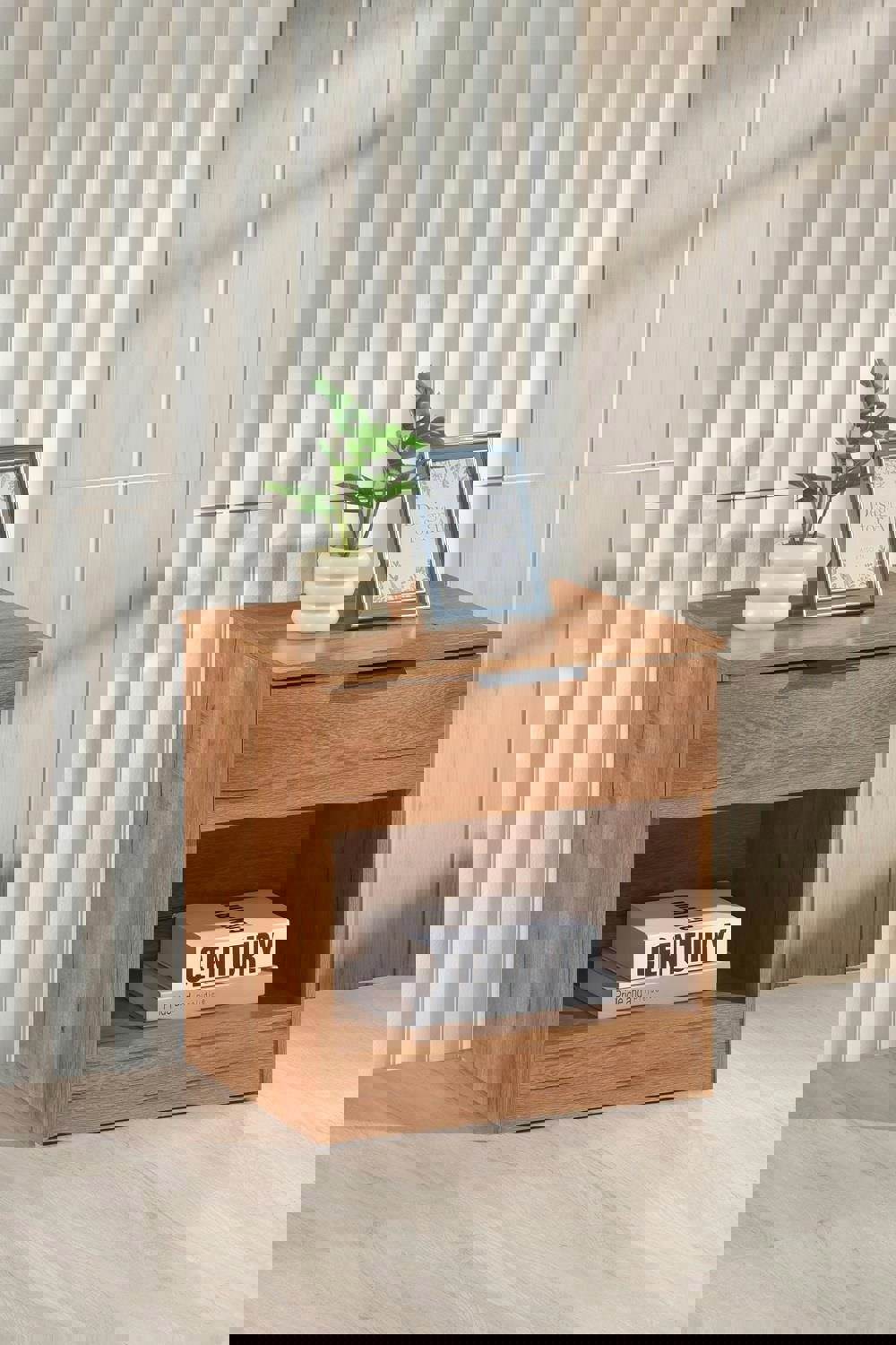 The table includes one smooth-gliding drawer, perfect for keeping personal items neatly tucked away. Below, an open shelf offers easy access to books, décor, or night time essentials. Finished with sleek metal handles for a subtle industrial touch, this bedside table strikes the perfect balance between style and utility.