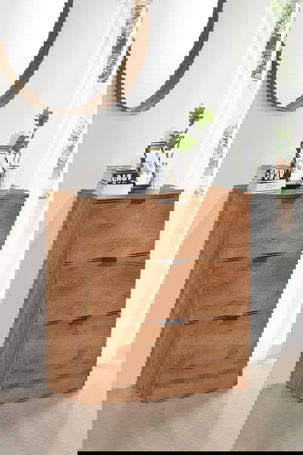 Each drawer glides smoothly and is adorned with sleek metal handles that add a contemporary touch to the classic wood grain. Built from high-quality materials for lasting durability, this chest combines form and function in one compact, stylish design.