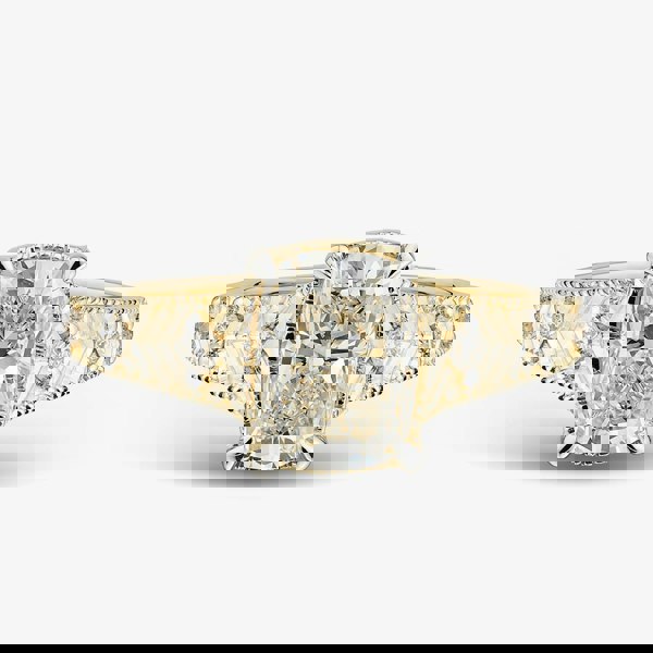 Exude refined elegance with the 14ct Yellow Gold Certified 2. 10ct Cushion Cut Lab-Grown Diamond Shoulder Set Ring. Crafted in radiant 14ct yellow gold, this exquisite ring features a cushion-cut lab-grown diamond centre, flanked by patterned shoulders set with brilliant-cut diamonds for added depth and sparkle. A perfect statement piece for special occasions, it combines sophistication, glamour, and timeless luxury.