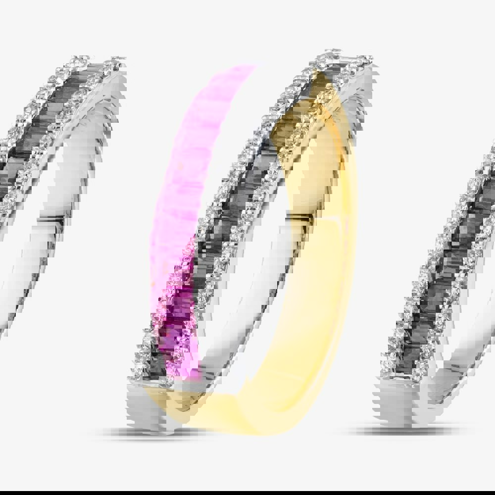 This stunning 18ct yellow and white gold half eternity ring features three rows of alternating baguette-cut rubies and brilliant-cut diamonds. The combination of vibrant rubies and sparkling diamonds, set in a unique two-tone design, creates a sophisticated and timeless piece.