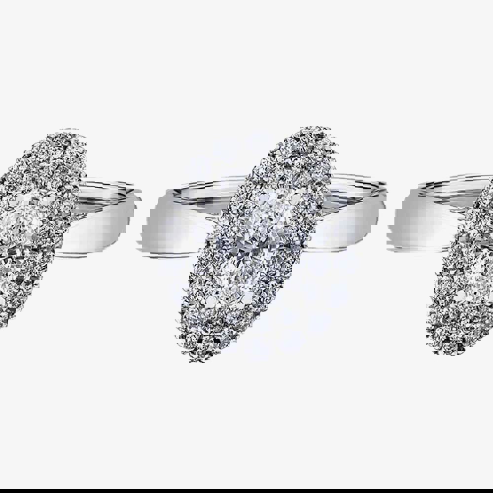 The opulent 0. 30ct oval diamond occupying the centrepiece of this ring is supplemented by forty eight smaller diamonds, set into the twin halos and into the mount.