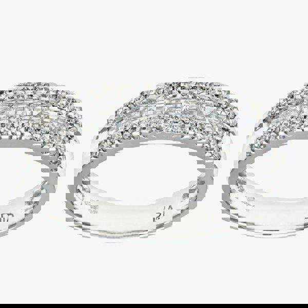This modern half eternity ring is crafted in 18ct white gold & features diamonds in a three-row design with a central baguette cut row with a brilliant cut row of diamonds either side which have a total carat weight of 0. 58ct. This ring is a perfect stand-alone piece or ideal for layering & combining with other rings to create your own unique look.