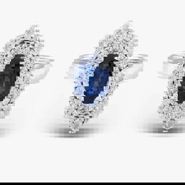 Embrace subtle luxury with this captivating two-row halo ring. Delicately crafted from 18ct white gold, it features a captivating 0. 91ct oval-cut sapphire, its deep blue brilliance radiating from the centre. Two rows of dazzling 0. 82ct brilliant-cut white diamonds, each meticulously set in a four-claw setting, complement the sapphire. The perfect accompaniment for any special occasion, this ring promises to leave a lasting impression.