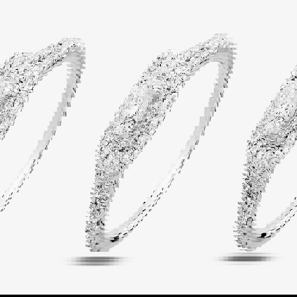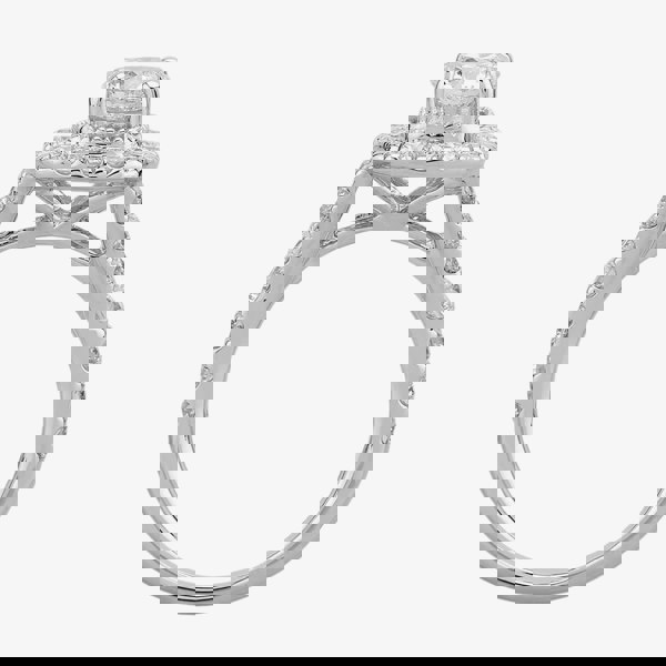 A large centre diamond is held in a four claw beaded frame before being surrounded by a square halo of smaller stones to create an eye-catching mount. Pave-set split shoulders flow down from the halo to graduate down to the smooth 18ct white gold shank.