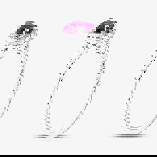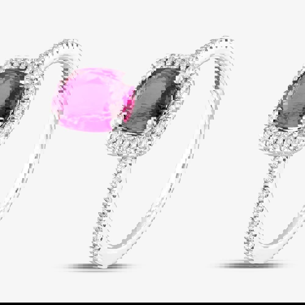 This stunning 18ct white gold shoulder-set halo ring showcases a vibrant oval-cut ruby at its centre, weighing 1. 53 carats. Encircled by brilliant-cut diamonds and further adorned with diamonds along the shoulders, the total diamond weight is 0. 50 carats. The ring is accompanied by certification, confirming the quality and authenticity of its gemstones.