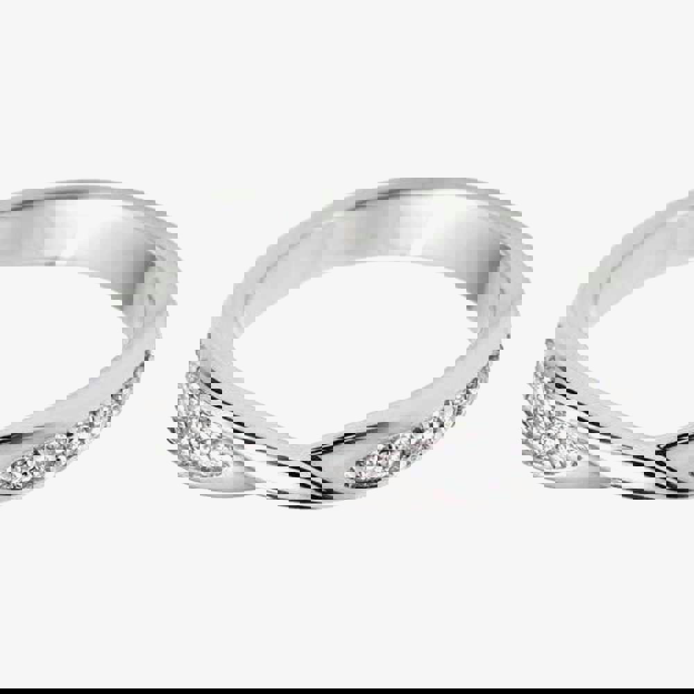 A beautifully stylish ladies wedding ring crafted from luxurious 18ct white gold, producing a top quality finish that shines brilliantly. The elegant 3. 3mm band features an attractive twist design adorned with dazzling diamonds. These radiant brilliant cut stones have a colour H and clarity SI, with a weight of 0. 17ct.