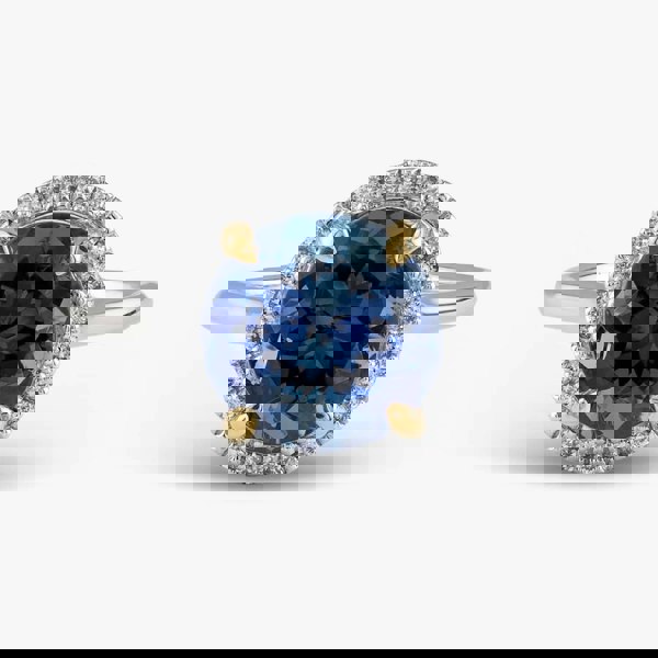 Crafted with a touch of simplicity, this halo ring exudes timeless elegance. Delicate 18ct white gold embraces a 3. 51ct brilliant-cut two-colour tanzanite centre stone, accentuated with a 0. 12ct brilliant-cut white diamond halo. The perfect accompaniment for any special occasion, this ring promises to leave a lasting impression.