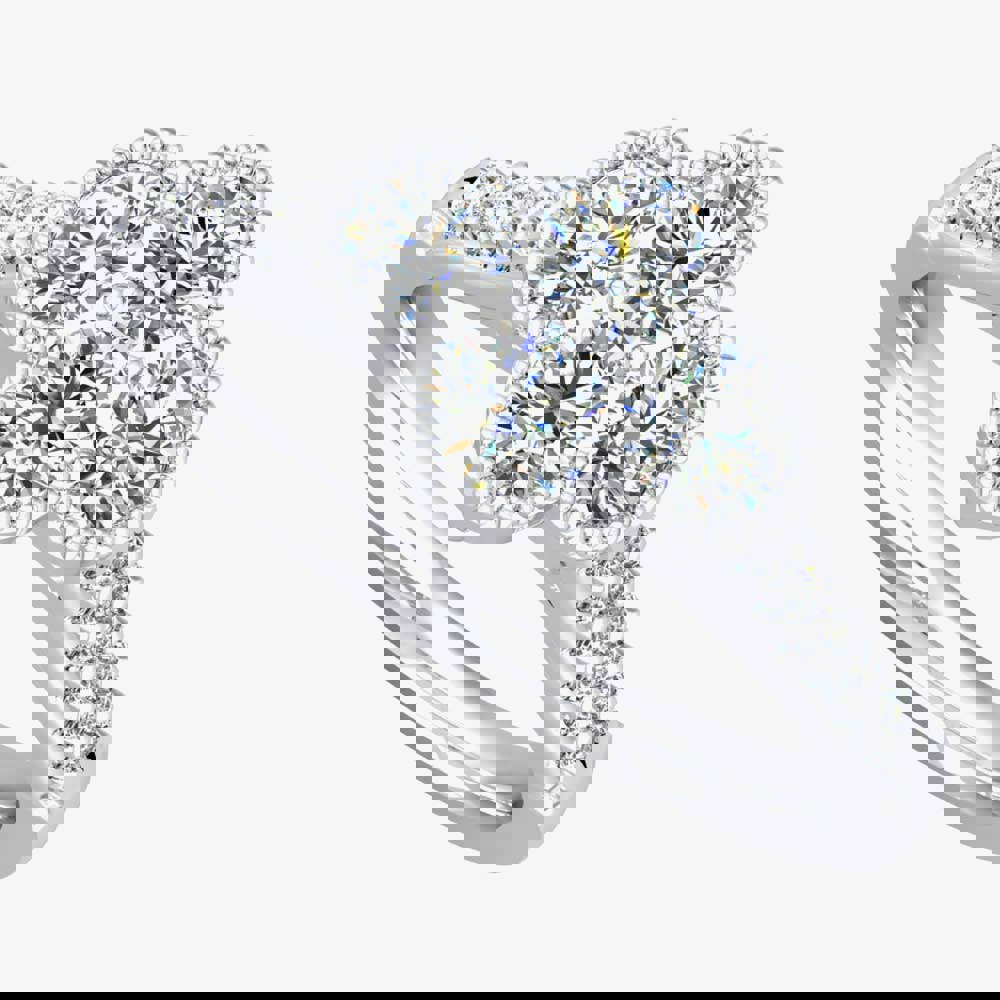 This contemporary cluster design features four beaded bezel-set brilliant diamonds in the central mount and pavé diamond shoulders for an extra touch of luxury.