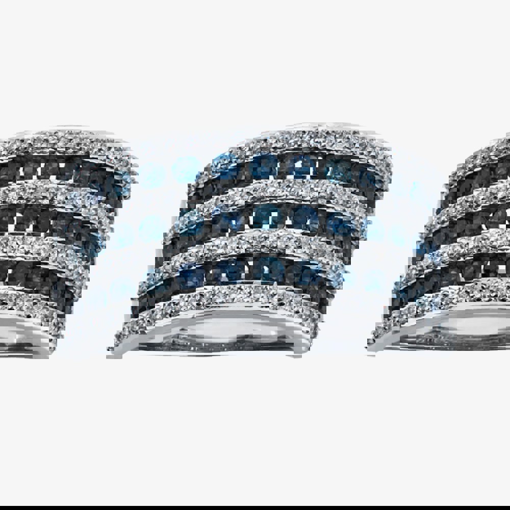 Give a stunning gift to someone special with this dazzling seven row ring, crafted from luxurious 18ct white gold in a gorgeous alternating gemstone design. Featuring four rows of twinkling diamonds with an impressive total weight of 0. 30ct, alternating between three rows of sparkly deep blue topaz. Bring this glamorous ring to your outfits for an eye catching shimmer on your ring finger, buy with confidence.