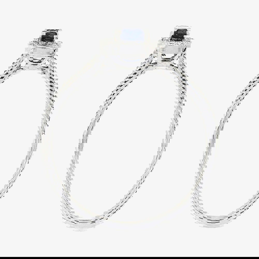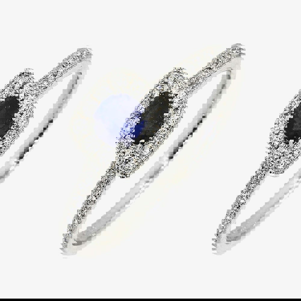 This exquisite 18ct white gold ring features a dazzling brilliant cut diamond at its centre, elegantly encircled by a shimmering halo of diamonds. The shoulders are adorned with a striking combination of sparkling diamonds and deep blue sapphires, adding a timeless touch of colour and sophistication. A perfect blend of classic elegance and modern luxury.