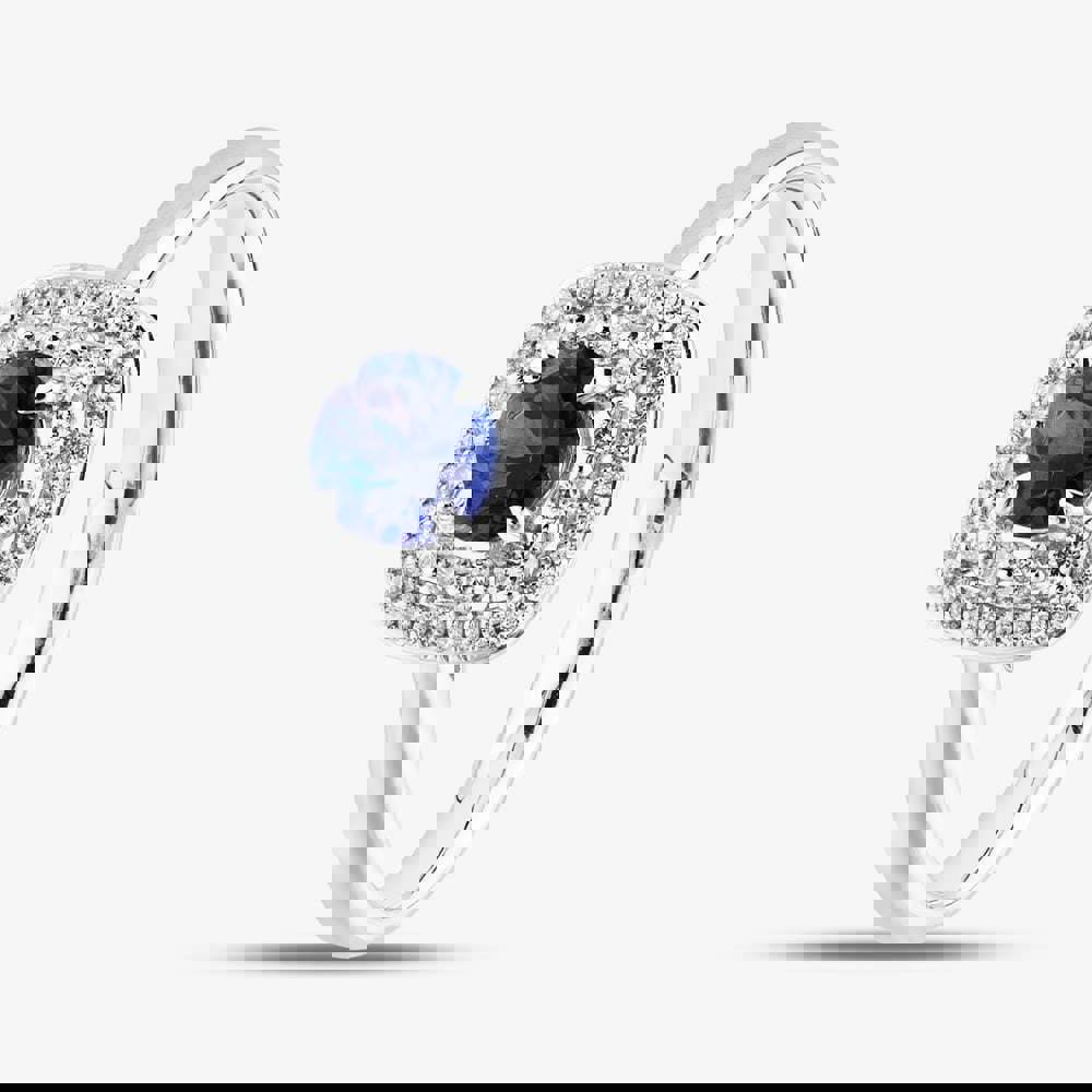 A sophisticated 18ct white gold ring showcasing a brilliant-cut sapphire in a classic four-claw setting at its centre. The centrepiece is elegantly surrounded by two rows of sparkling diamonds in a halo style, enhancing the sapphire's deep blue hue and adding a touch of timeless brilliance.