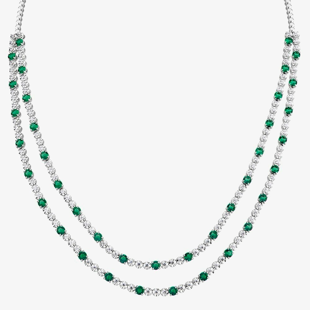 Clean lines and vivid colour meet in the T.H.Baker HSN1061(EM) necklace, a two-row tennis-style design crafted in 18ct white gold. Alternating round green emeralds bring a rich, jewel-toned rhythm across the piece, while brilliant cut diamonds add crisp sparkle for a refined finish.