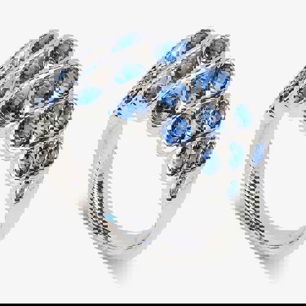 This pretty dress ring combines a repeating infinity motif with tension set sapphires in each aperture, providing a bright pop of colour and a wonderful rubover texture.