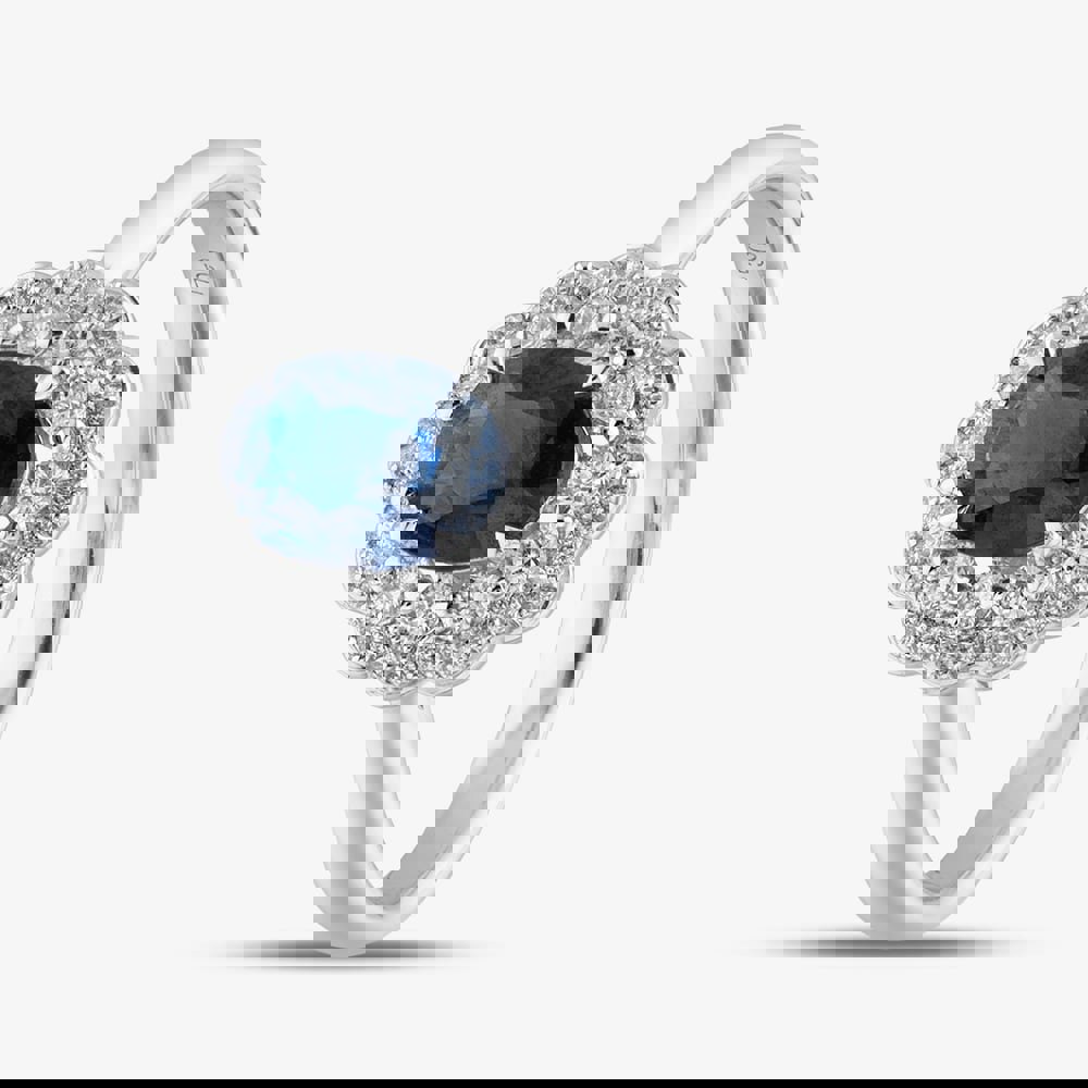 This stunning 18ct white gold ring features a captivating oval-cut sapphire securely held in a four-claw setting. Surrounding the sapphire, brilliant-cut diamonds form a dazzling double halo, enhancing the ring's elegance and brilliance. A timeless and sophisticated design perfect for any special occasion.