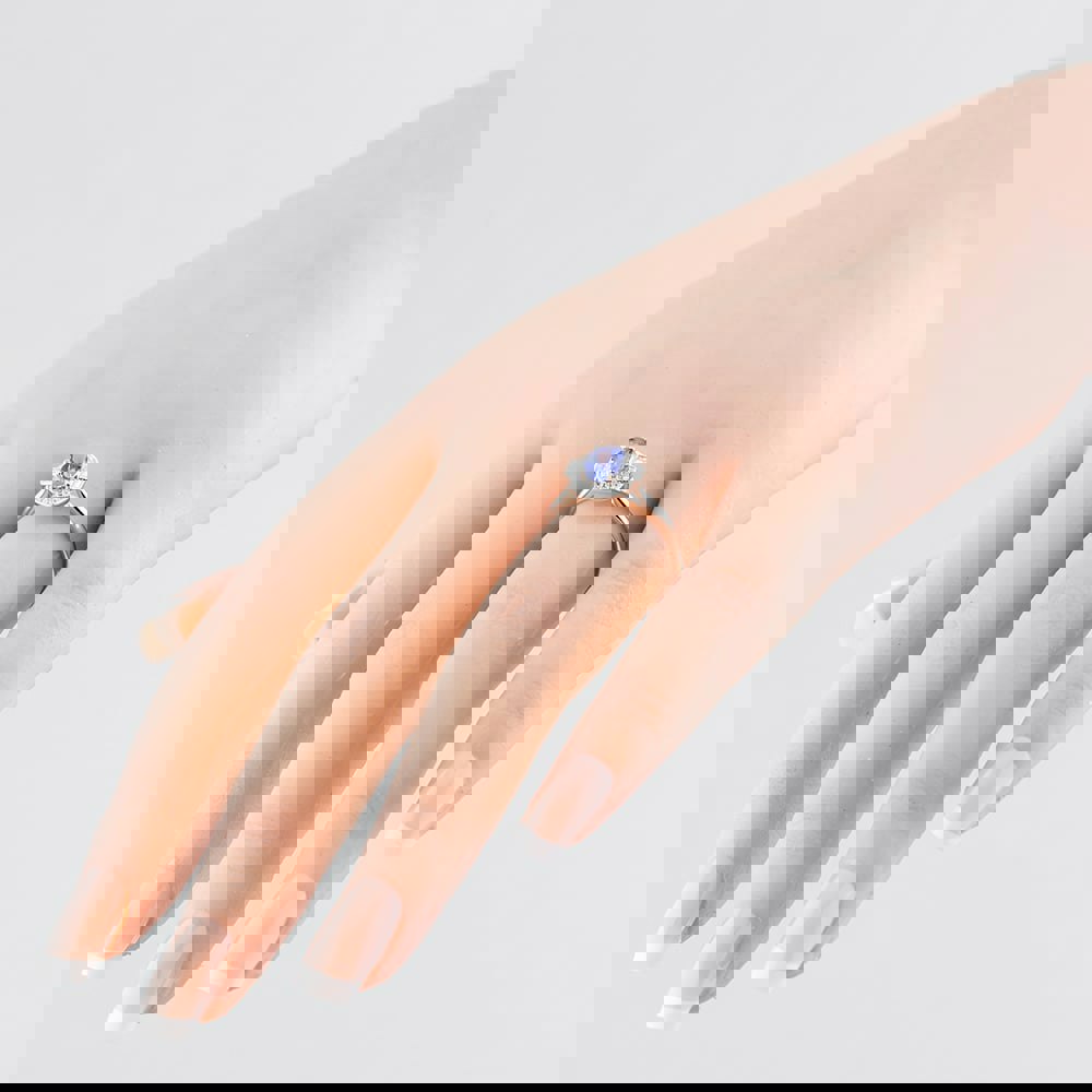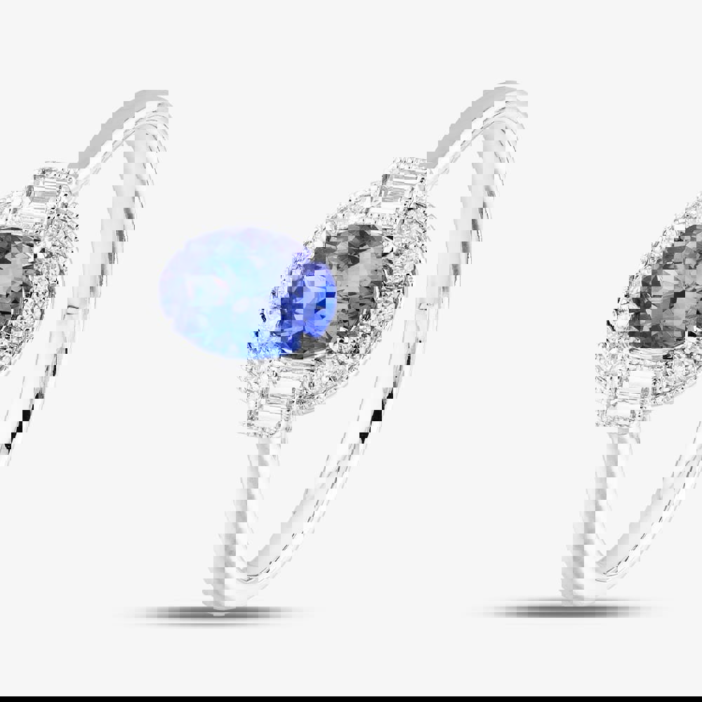 A stunning 18ct white gold ring featuring an oval-cut tanzanite in a classic four-claw setting, encircled by a halo of brilliant-cut diamonds. Enhanced by two baguette-cut diamonds, one on each side, this design exudes timeless elegance and sophistication.