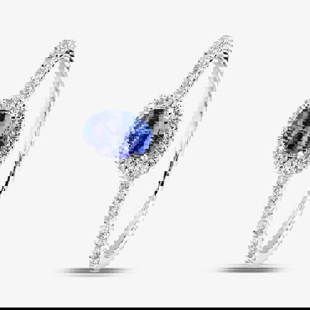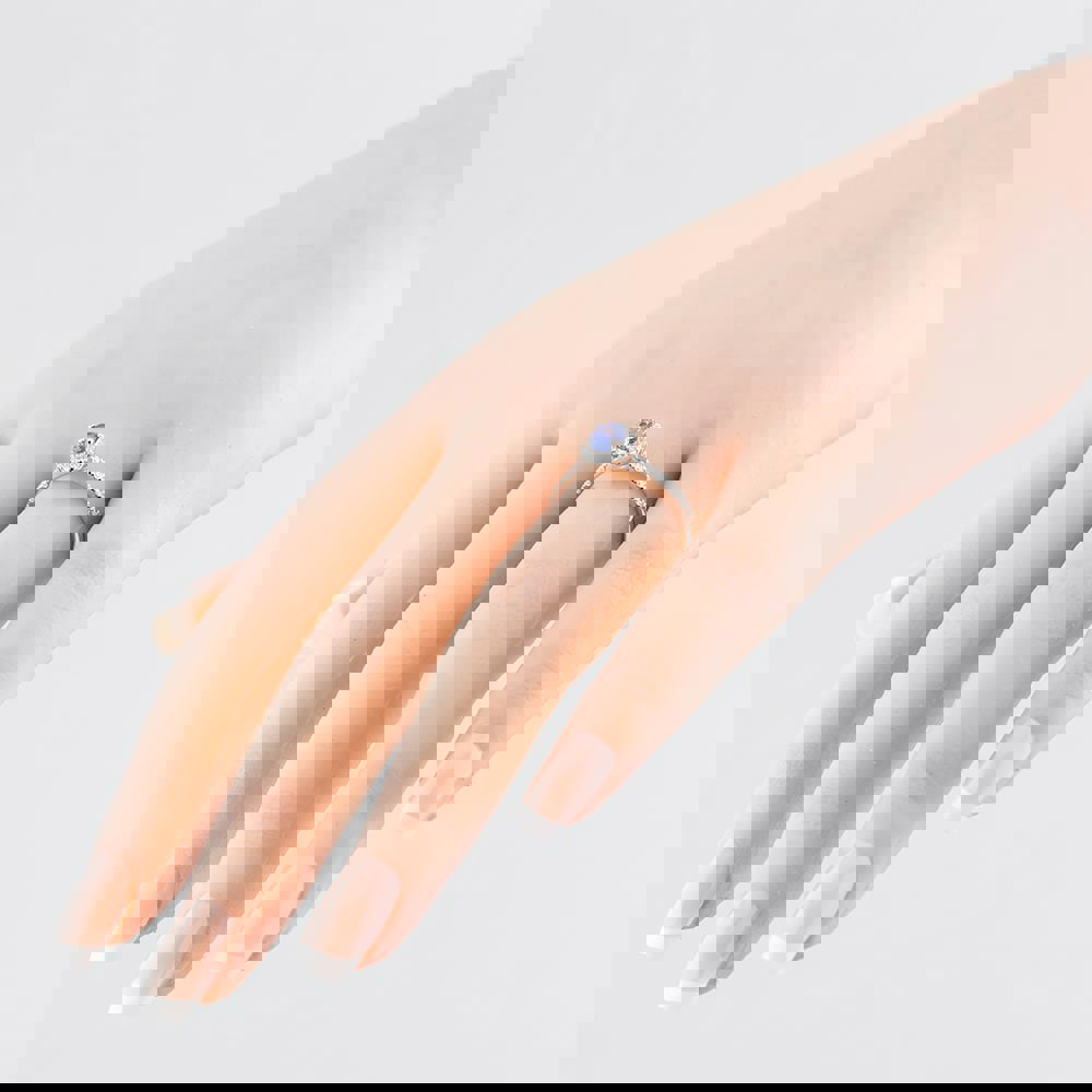 An exquisite 18ct white gold halo ring featuring an oval-cut tanzanite secured in a classic four-claw setting, elegantly surrounded by sparkling diamonds that continue down the shoulders. A timeless piece of refined beauty.