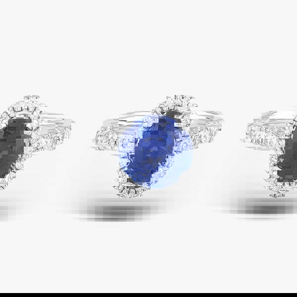 Crafted with a touch of simplicity, this shoulder-set halo ring exudes timeless elegance. Delicate 18ct white gold embraces a sparkling round-cut sapphire centre stone, adorned with a halo of brilliant-cut white diamonds enhancing the centre stone, while the shoulders glisten with their diamond-encrusted brilliance. Each stone, nestled in a classic four-claw setting, promises to sparkle with every movement, making this ring a timeless symbol of subtle luxury.
