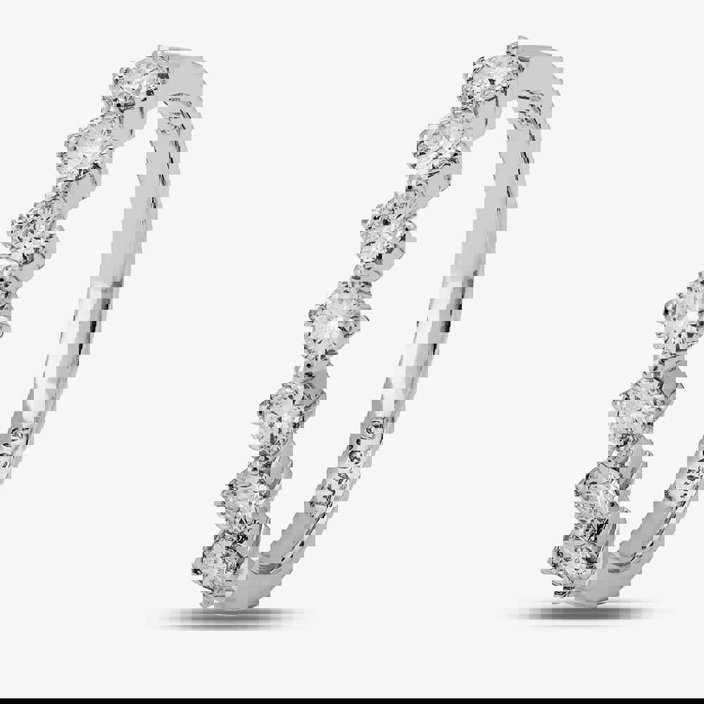 This half-eternity ring has a twist bridge, where each of the seven diamonds four-claw settings has been turned through 90 degrees to point in the cardinal compass directions.