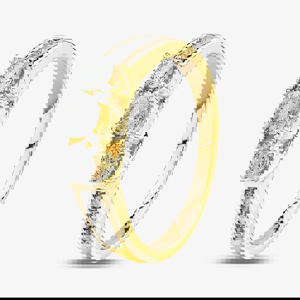 This beautiful three-stone ring is delicately crafted from 18ct yellow gold, adorned with three brilliant cut white diamonds, set in a four-claw setting in the centre with channel set diamonds on the shoulders, with an total weight of 1. 00ct