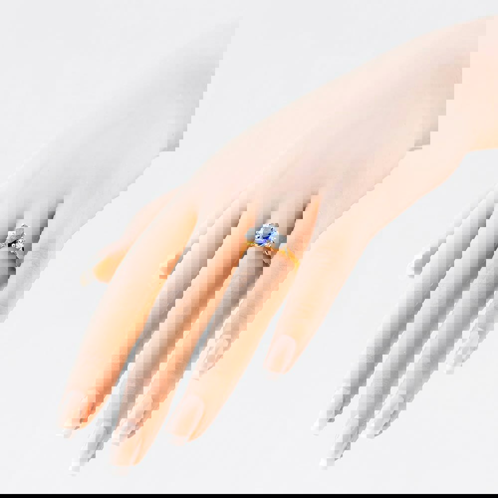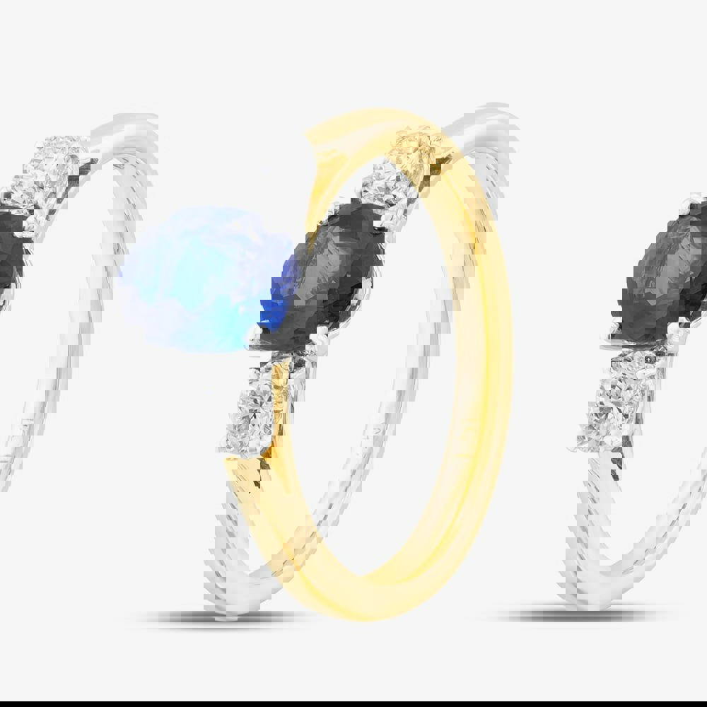 This elegant 18ct yellow gold ring features a stunning shoulder set solitaire design. At the centre is a brilliant 1. 51ct oval shaped blue sapphire. On either side of the sapphire are two 0. 51ct sparkling diamonds, perfectly complementing the centre stone with their dazzling brilliance. The warm tone of the yellow gold band enhances the contrast between the vibrant sapphire and the crisp white diamonds, creating a timeless and luxurious piece of jewellery.